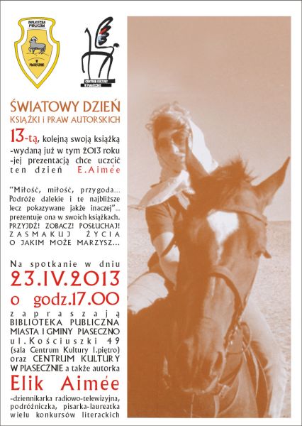 23 kwietnia 2013 roku o godz. 17.00 zapraszamy na spotkanie z dziennikarką radiowo-telewizyjną, podróżniczką, pisarką i laureatką wielu konkursów literackich - Elik Aimee. Prezentacja najnowszej książki Pani Elik odbędzie się w sali Centrum Kultury w Piasecznie (I piętro). Zapraszamy!