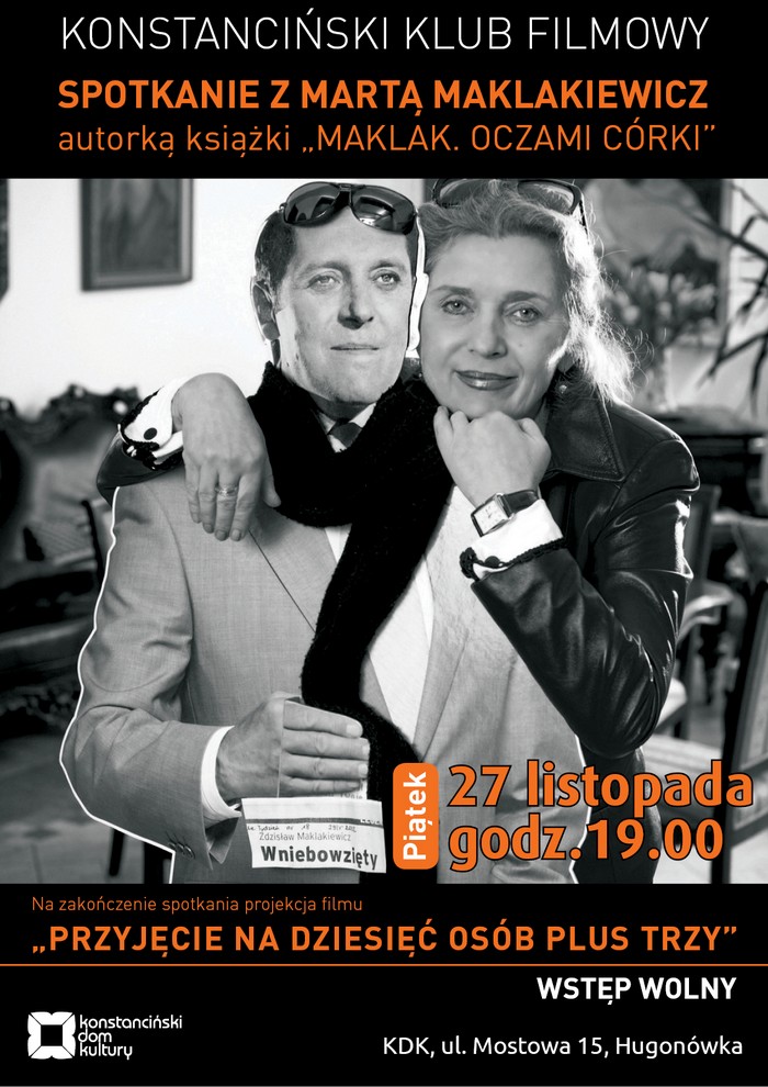 27 listopada 2015 r. o godz. 19.00 odbędzie się spotkanie z Martą Maklakiewicz autorką książki „Maklak. Oczami córki” oraz projekcja filmu „Przyjęcie na dziesięć osób plus trzy” reż J. Gruza. Wstęp wolny. Szczegóły na plakacie: