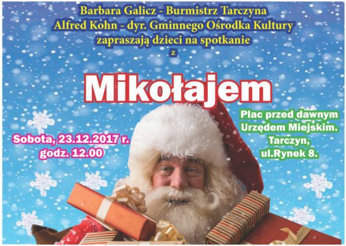 23 grudnia 2017 roku o godzinie 12:00 odbędzie się Spotkanie z Mikołajem w Tarczynie. Szczegóły na poniższym plakacie. Zapraszamy dzieci na spotkanie z Mikołajem. Takiej okazji nie można opuścić.