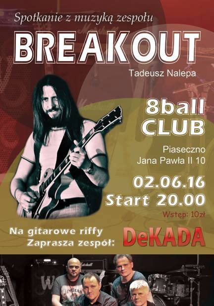 2 czerwca o godzinie 20:00 odbędzie się spotkanie z muzyką Breakout - zagra zespół Dekada. Wstęp 10 zł. Miejsce: 8 Ball Club Jana Pawła II 10, Piaseczno.