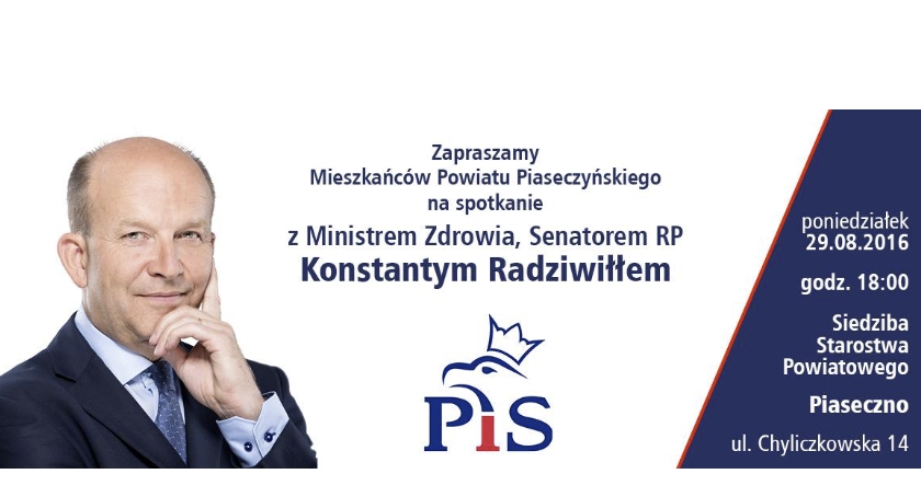 29 sierpnia 2016 r. o godz. 18:00 odbędzie się spotkanie z Senatorem RP Konstantym Radziwiłłem, Ministrem Zdrowia. Miejsce: Starostwo Powiatowe w Piasecznie ul. Chyliczkowska 14, Piaseczno.