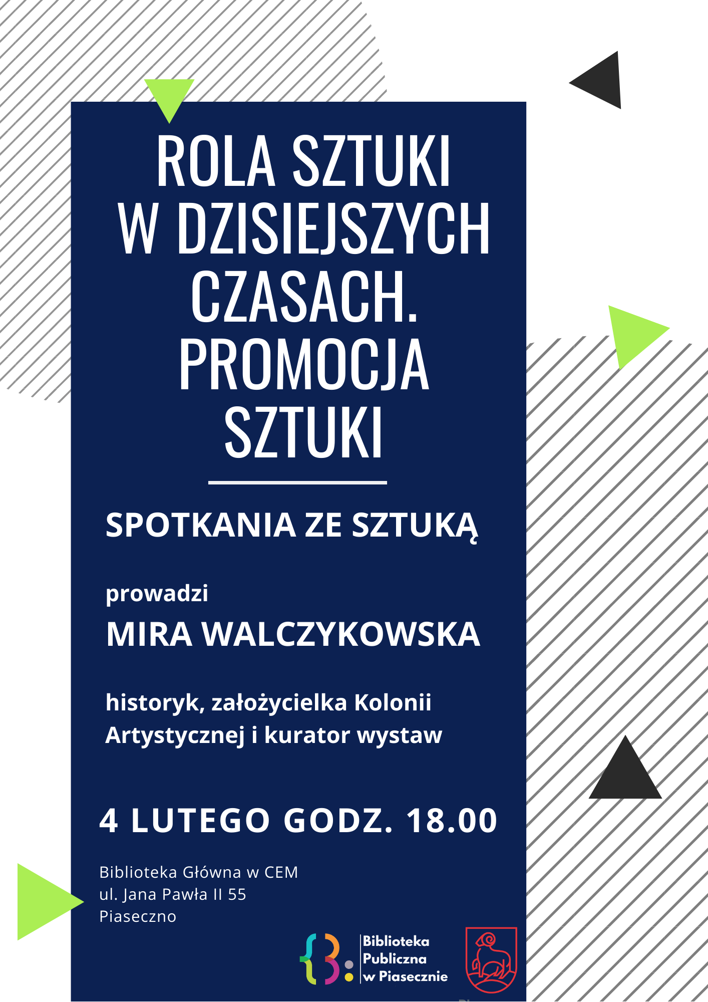 Pierwsze spotkanie 4 lutego godz. 18.00. Tematem będzie rola sztuki w dzisiejszych czasach i promocja sztuki. Wykład poprowadzi Mira Walczykowska – historyk, założycielka Kolonii Artystycznej i kurator wystaw. Wstęp wolny, zapraszamy – Biblioteka Publiczna w Piasecznie, II piętro.