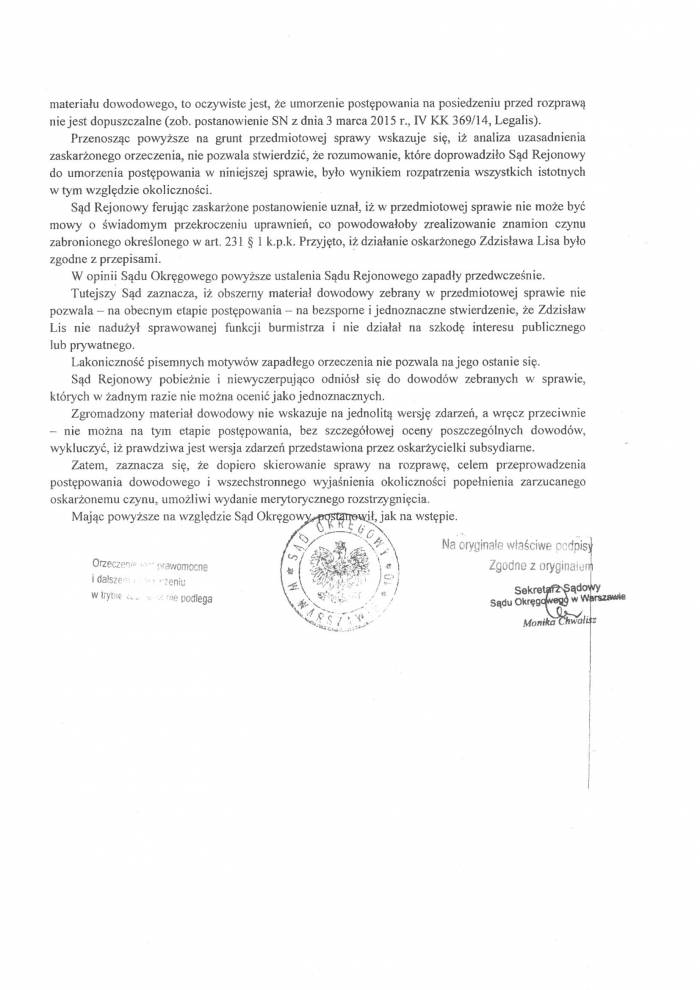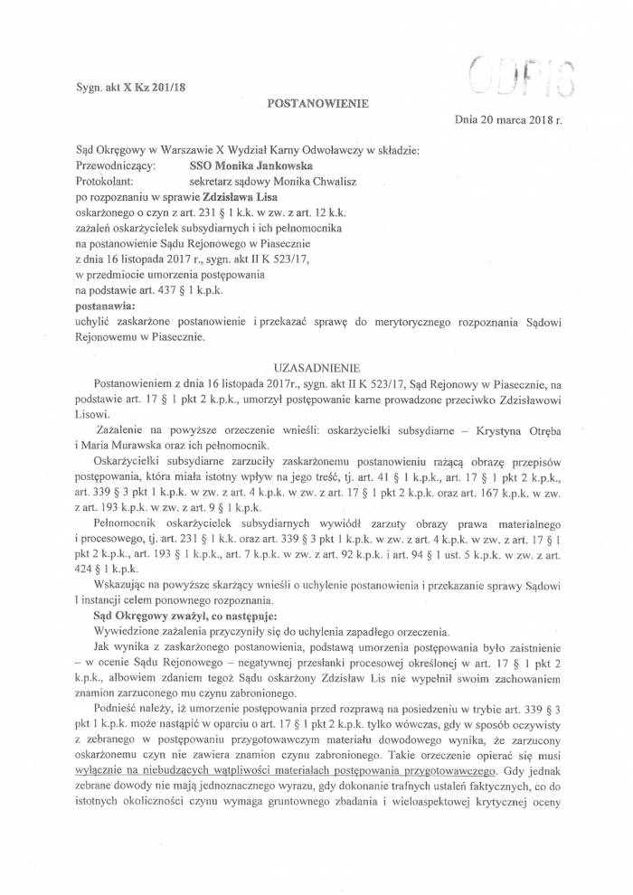 20 marca br. w Sądzie Okręgowym w Warszawie odbyła się rozprawa w sprawie Zdzisława Lisa oskarżonego o czyn z art.231 par.1k.k zażaleń oskarżycielek subsydiarnych i ich pełnomocnika na postanowienie Sądu Rejonowego w Piasecznie z dnia 16.11.17 w przedmiocie umorzenia postępowania. Niżej przedstawiamy w całości postanowienia Sądu wraz z uzasadnieniem, otrzymane od właścicieli przedszkoli.