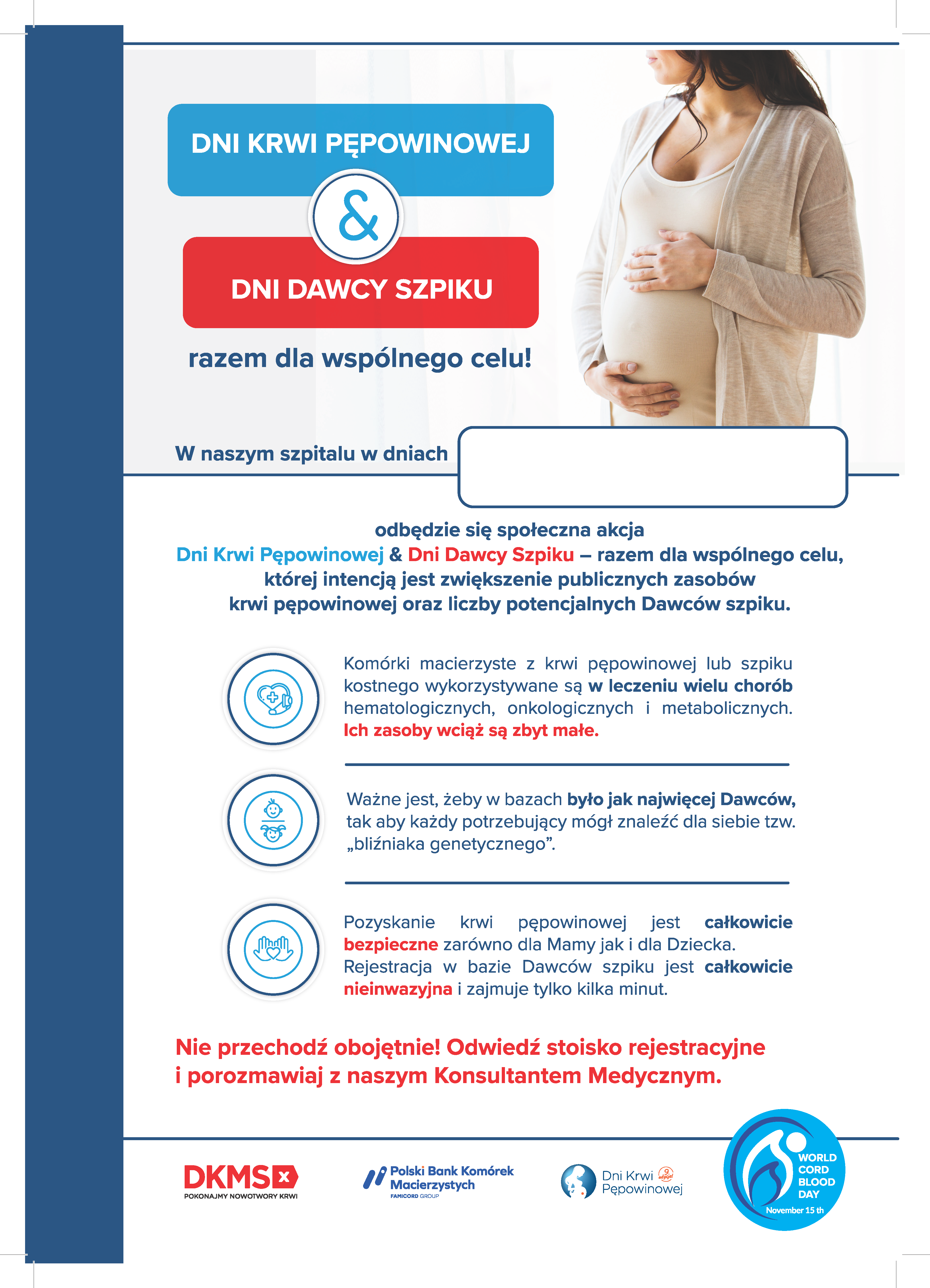 W dniach 17-26 listopada w wybranych szpitalach, w 8 województwach w Polsce: kujawsko-pomorskie, zachodniopomorskie, lubelskie, łódzkie, opolskie, mazowieckie, śląskie, wielkopolskie będzie można bezpłatne przekazać krew pępowinową na cele publiczne. Jednocześnie wszyscy obecni w oddziałach będą mogli zarejestrować się jako potencjalni dawcy szpiku kostnego w bazie dawców Fundacji DKMS. Każdy dawca szpiku, w zależności od liczby przeprowadzonych procedur, otrzyma odznakę honorową. Ponadto dzieci, których rodzice zdecydowali się oddać krew pępowinową, otrzymają specjalny certyfikat „Najmłodszego Honorowego Dawcy Krwi Pępowinowej”. Więcej informacji o akcji i placówkach biorących w niej udział TUTAJ [kliknij].