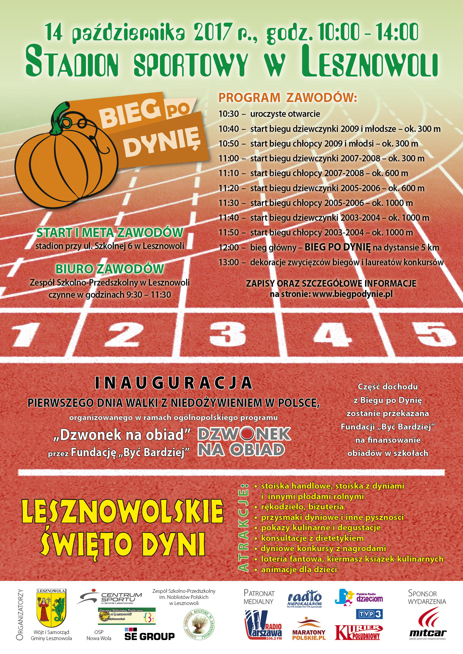 Święto Dyni i Bieg po Dynię to dwa duże wydarzenia, na które 14 października zapraszają Wójt i Samorząd Gminy Lesznowola. Imprezy promują zdrowy tryb życia i podkreślają lokalną specyfikę gminy, gdzie mieszka wielu producentów tego warzywa a ulica Słoneczna już we wrześniu ozdobiona jest kolorowymi stoiskami z dyniami.