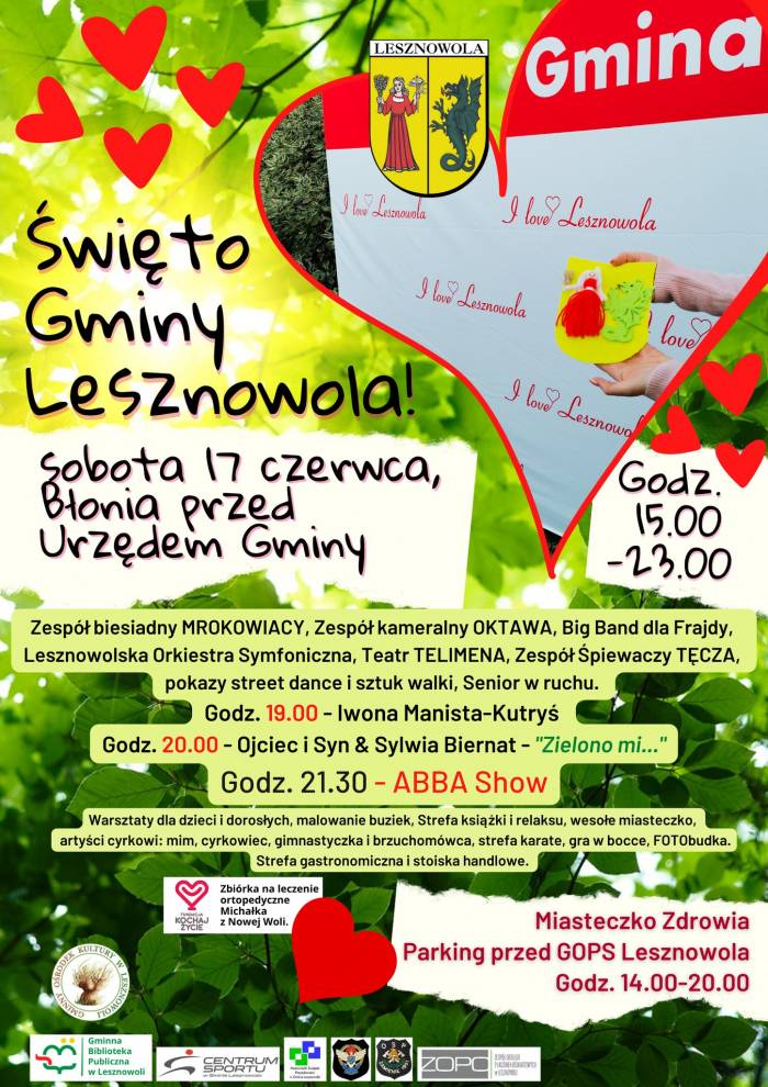 W sobotę 17 czerwca 2023 roku spotkajmy się na błoniach przed Urzędem Gminy w Lesznowoli, gdzie odbędzie się Święto Gminy Lesznowola. Warto zapisać ten termin w kalendarzu i skorzystać z atrakcji - już tradycyjnie, najwięcej niespodzianek czeka na najmłodszych.