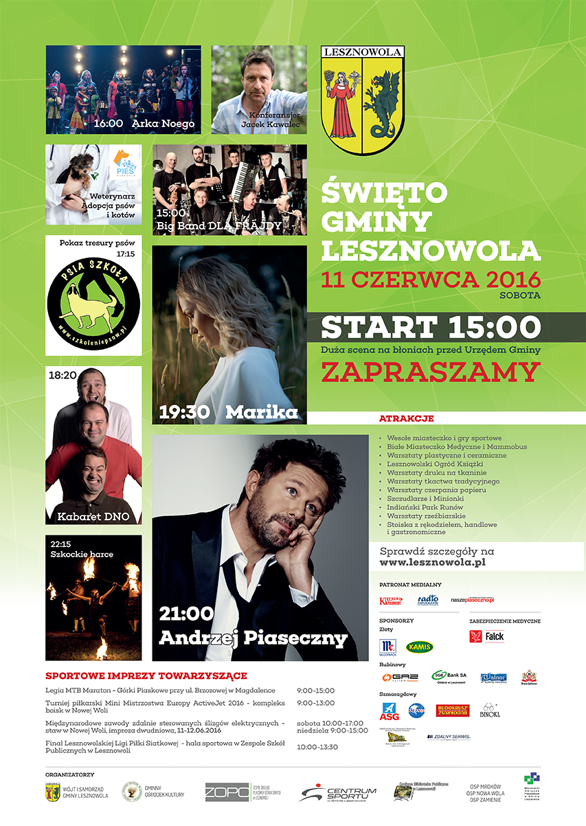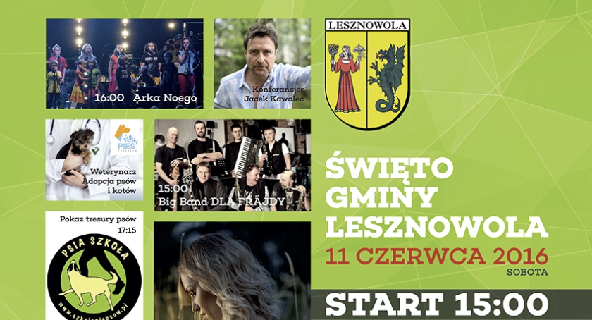 Koncert Andrzeja Piasecznego, Mariki i Arki Noego to tylko niektóre z mnóstwa atrakcji przygotowanych z okazji tegorocznego Święta Gminy. 11 czerwca zapraszamy na największy w naszej Gminie festyn - Święto Gminy Lesznowola 2016! Zapraszamy na błonia przed Urzędem Gminy w Lesznowoli, gdzie odbędą się centralne obchody. Początek imprezy o godz. 15.00.