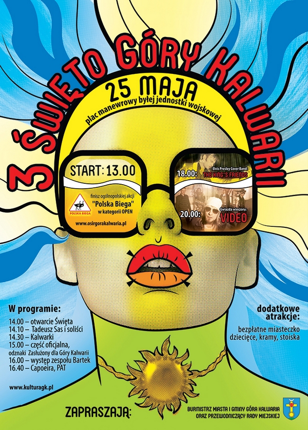 25 maja 2013 r. o godz. 14.00 odbędzie się Święto Góry Kalwarii. Miejsce: Plac manewrowy byłej jednostki wojskowej w Górze Kalwarii. Poniżej umieszczamy program. Oprócz tego, będą stoiska, catering, bezpłatny plac zabaw dla dzieci. Prowadzi Pani Aleksandra Fedynicz. Program III Święta Góry Kalwarii:13.00 - 14.00 finisz ogólnopolskiej akcji „Polska biega” w kategorii Open - meta na placu manewrowym byłej jednostki wojskowej14.00 - rozpoczęcie uroczystości, przekazanie klucza do symbolicznych bram miasta Mieszkańcowi Góry Kalwarii14.20 - Tadeusz Sas i soliści w programie o Górze Kalwarii15.00 - część oficjalna, nadanie tytułu Zasłużony dla Góry Kalwarii: Wodne Ochotnicze Pogotowie Ratunkowe w Górze Kalwarii, Związek Emerytów, Inwalidów i Rencistów w Górze Kalwarii, Cech Rzemiosł Różnych i Handlu w Górze Kalwarii, Pan Edward Królak, lekarz16.00 - występ zespołu BARTEK16.40 - pokaz CAPOEIRY, występ dziecięcego zespołu ludowego Kalwarki oraz program artystyczny PAT (Program Profilaktyka a Ty)18.00 - The King"s Friends - Cover Band Elvisa Presleya20.00 - występ gwiazdy wieczoru: VIDEO