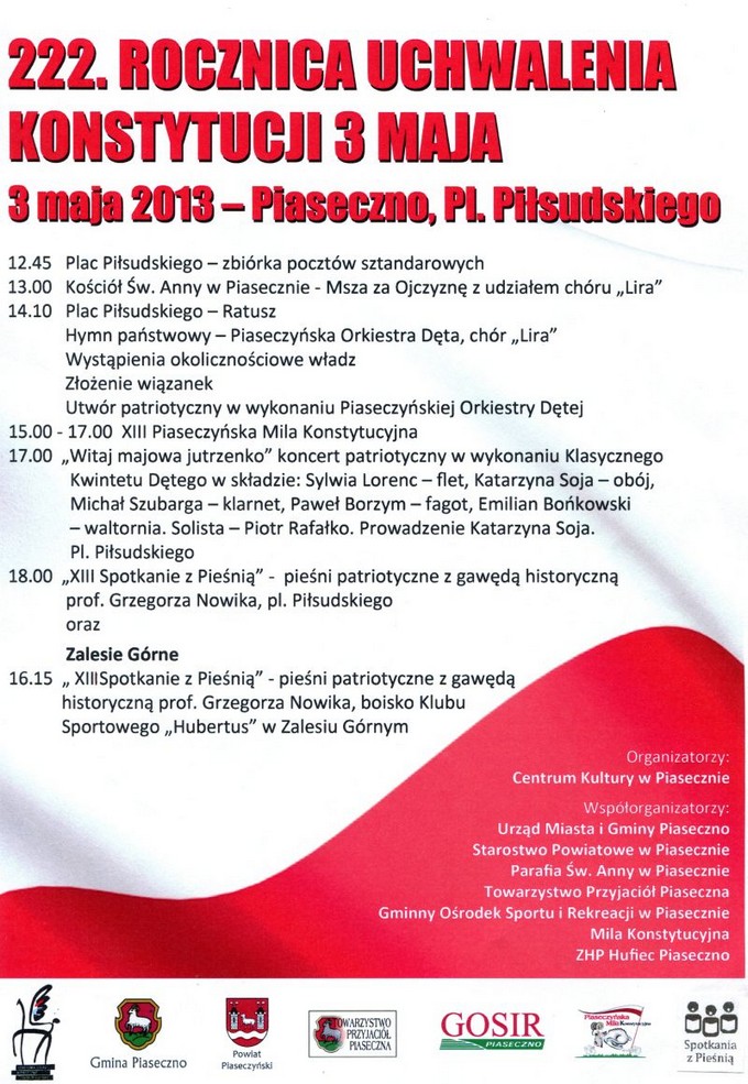 Program:godz. 13.00 - msza św. w kościele św. Anny w Piaseczniegodz. 14.00 - uroczystości przed Ratuszemgodz. 15.00 - 17.00 - XIII Piaseczyńska Mila Konstytucyjna (pl. Piłsudskiego w Piasecznie); szczegółowe informacje i zapisy: www.mila-piaseczno.plgodz. 17.00 - Koncert "Witaj majowa jutrzenko" w wykonaniu Klasycznego Kwintetu Dętego (pl. Piłsudskiego)godz. 18.00 „Spotkanie z pieśnią” - pieśni patriotyczne z gawędą historyczna prof. Grzegorza Nowika (pl. Piłsudskiego w Piasecznie)godz. 16.15 „Spotkanie z pieśnią” - Zalesie Górne, boisko KS "Hubertus"