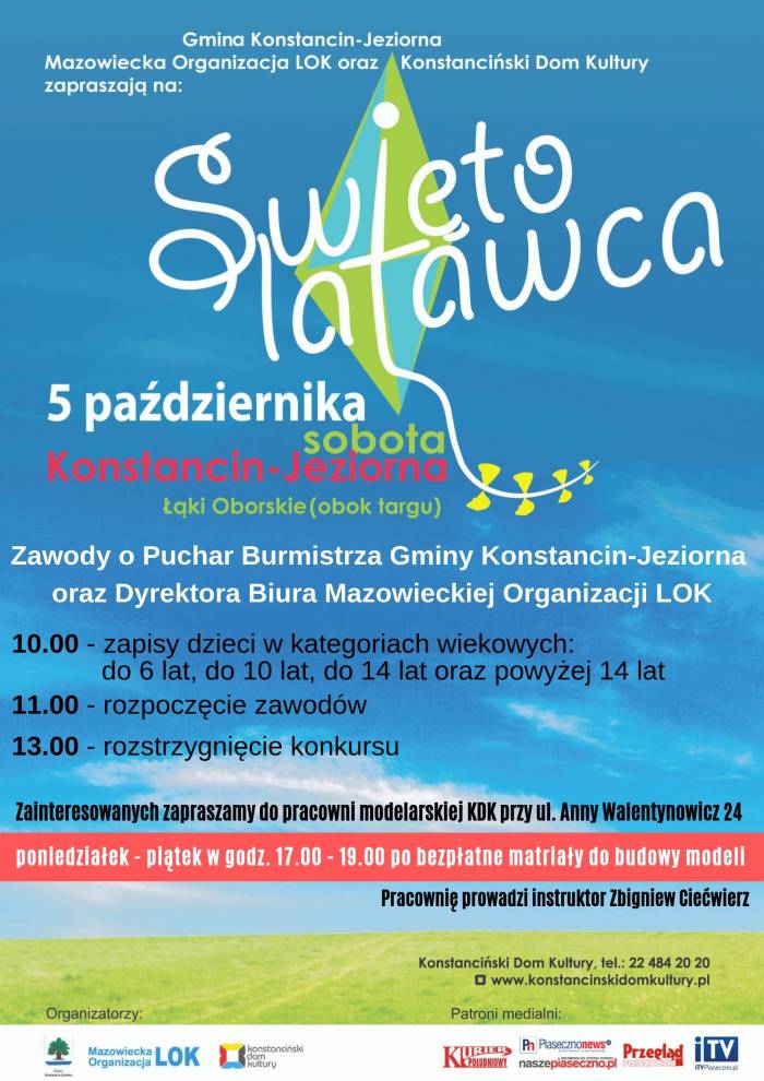 Konstanciński Dom Kultury zaprasza a doroczne święto latawca, które odbędzie się w sobotę 5 października na łąkach Oborskich (za targowiskiem przy al. Wojska Polskiego). Zawody o Puchar Burmistrza Gminy Konstancin-Jeziorna oraz Dyrektora Biura Mazowieckiej Organizacji LOK rozpoczną się o godz. 11. Zapisy zaczną się o godz. 10. To jedna z ostatnich rodzinnych imprez plenerowych w tym roku. Zapraszamy całe rodziny i zachęcamy nie tylko do startu w konkursie latawców, lecz także do dopingowania zawodnikom i podziwiania ich prac. Latawce biorące udział w konkursie muszą być wykonane własnoręcznie. Jury będzie oceniać latawce pod kątem oryginalności, sposobu wykonania i zdobienia. Osobno będzie oceniany lot. Konkurs dla młodych konstruktorów od 6 do 14 lat. Zainteresowani wzięciem udziału w zawodach mogą zgłosić się do pracowni modelarskiej KDK przy ul. Anny Walentynowicz 24 – od poniedziałku do piątku w godz. 17.00-19.00 po bezpłatne materiały do budowy modeli.