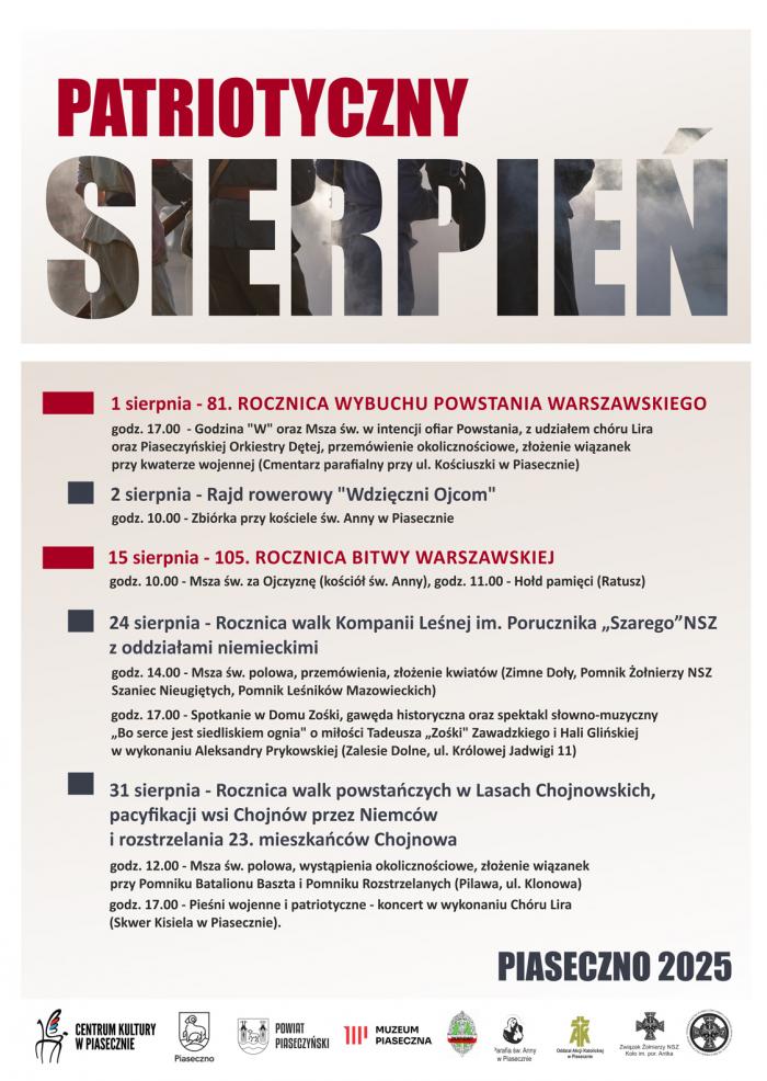15 sierpnia 2025 roku odbędzie się Święto Wojska Polskiego oraz 105. rocznica Bitwy Warszawskiej. O godz. 10.00 odbędzie się Msza św. za Ojczyznę (kościół św. Anny w Piasecznie), natomiast o godz. 11.00 – Hołd pamięci (Ratusz w Piasecznie). Wstęp wolny!