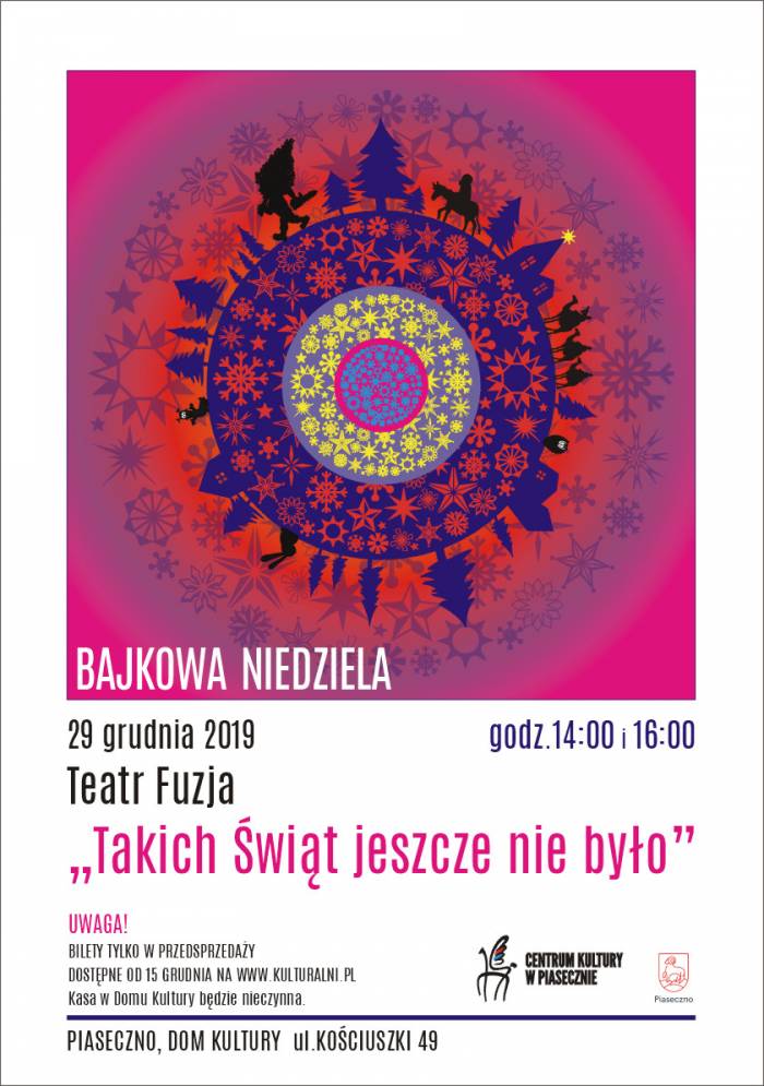 29.12.2019 r. o godz. 14.00 i 16.00 odbędzie się Bajkowa Niedziela. Wystąpi: Teatr Fuzja „Takich świąt jeszcze nie było”. Miejsce: Piaseczno, Dom Kultury, ul. Kościuszki 49. Bilety w cenie 10 złotych.