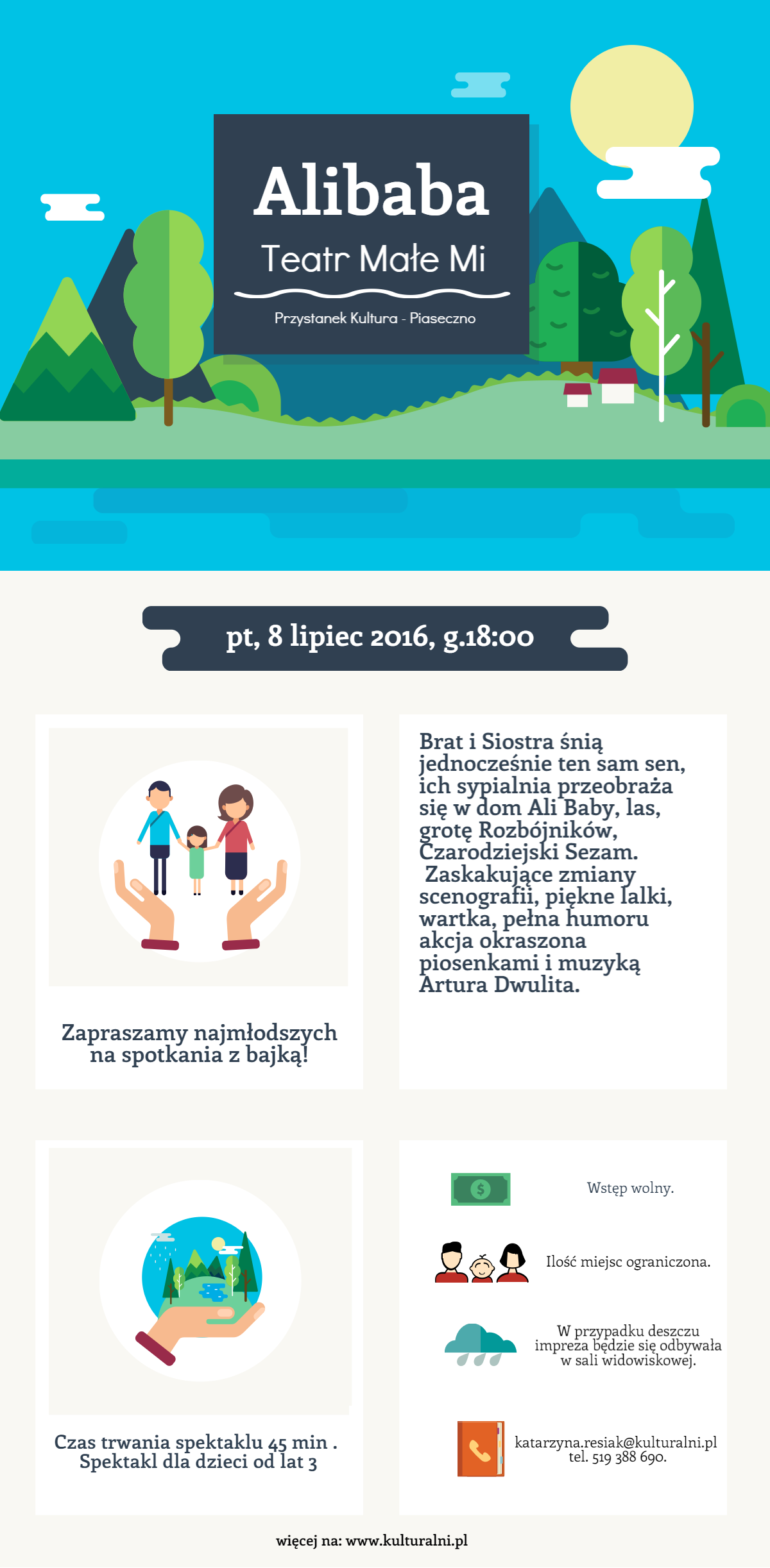 8 lipca o godz. 18.00 zapraszamy do Zakątku Kultury, gdzie wystąpi Teatr Małe Mi i przedstawi spektakl pt. Alibaba. Miejsce: Przystanek Kultura w Piasecznie.