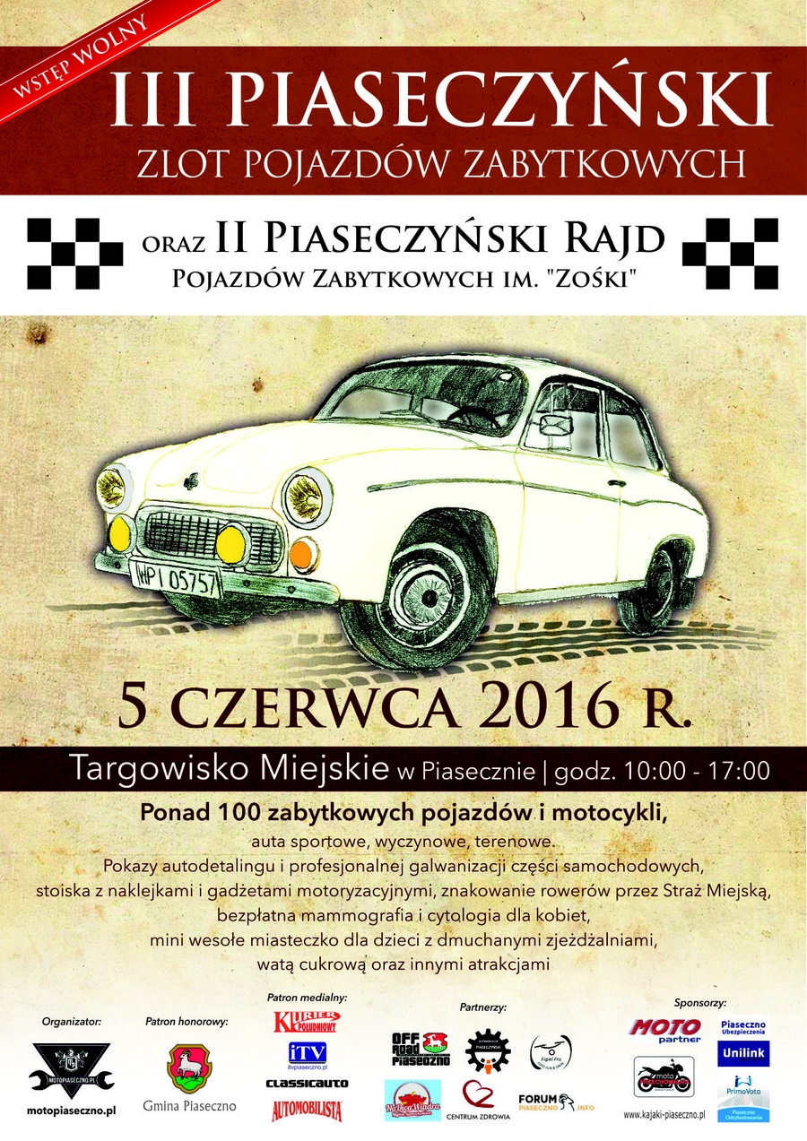 W najbliższą niedzielę czyli 5 czerwca 2016 r. zapraszamy na naszą kolejną edycję Piaseczyńskiego Zlotu Pojazdów Zabytkowych. Poprzednie edycje przyciągnęły mnóstwo aut zabytkowych, klasycznych oraz innych nietuzinkowych pojazdów a także zgromadziły rzesze ludzi chcących podziwiać ikony motoryzacji, które można było zobaczyć w jednym miejscu.