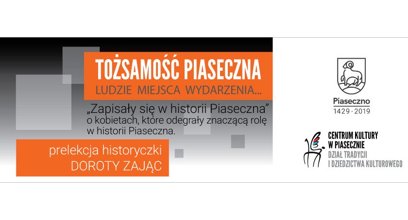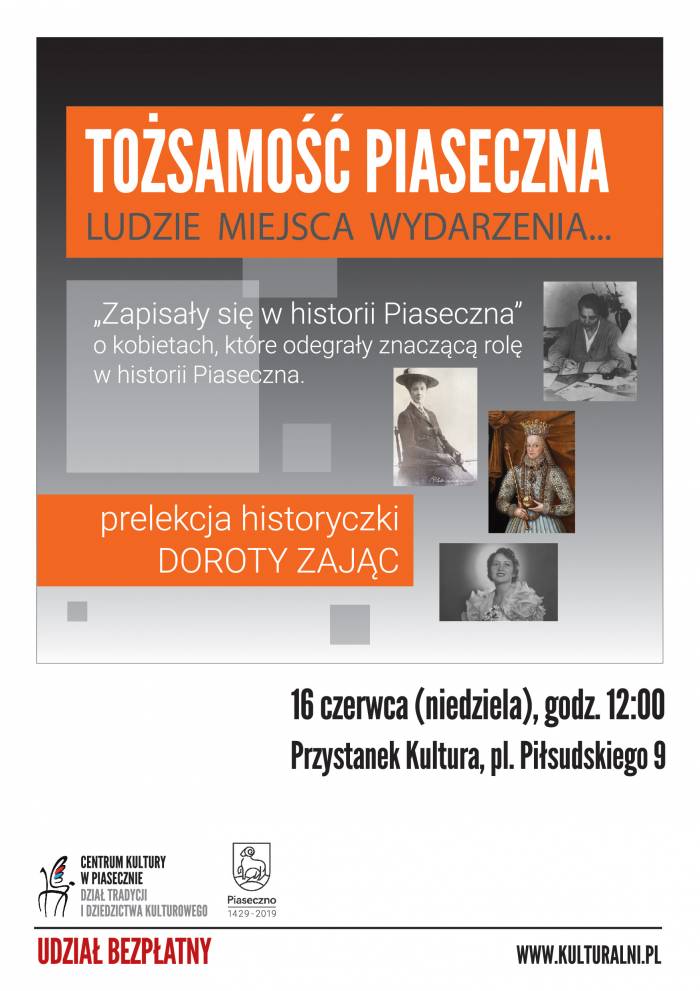 16 czerwca, godz. 12:00 TOŻSAMOŚĆ PIASECZNA. LUDZIE, MIEJSCA, WYDARZENIA „Zapisały się w historii Piaseczna” – prelekcja historyczki Doroty Zając o kobietach, które odegrały znaczącą rolę w historii Piaseczna. Miejsce: Piaseczno, Przystanek Kultura, pl. Piłsudskiego 9. Wstęp wolny
