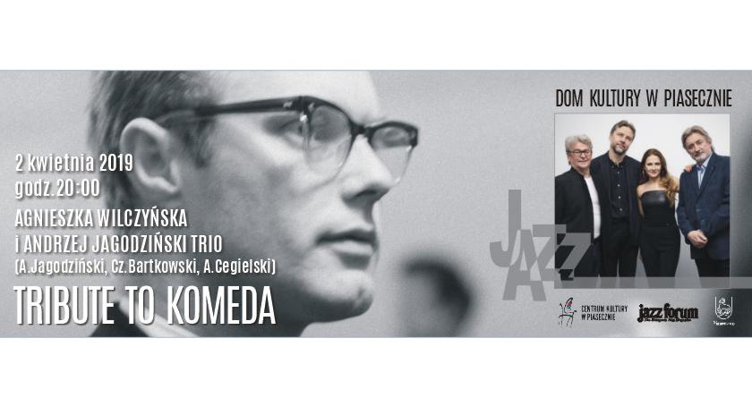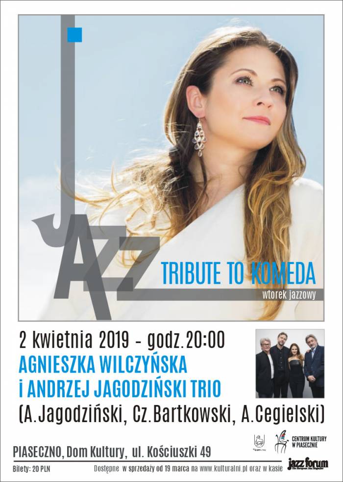 2 kwietnia 2019 roku o godz. 20:00 odbędzie się Wtorek Jazzowy - TRIBUTE TO KOMEDA w składzie: Agnieszka Wilczyńska i Andrzej Jagodziński trio (A. Jagodziński, Cz. Bartkowski, A. Cegielski). Miejsce: Dom Kultury w Piasecznie, ul. Kościuszki 49. Bilety w cenie 20 PLN.