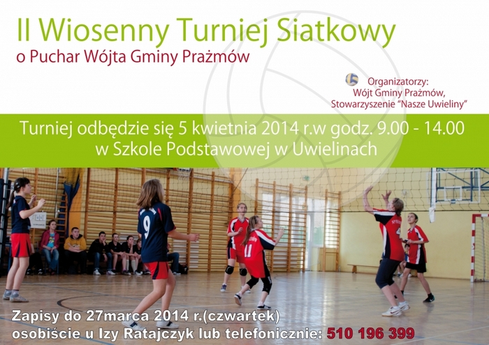 II Wiosenny Turniej Siatkowy o Puchar Wójta Gminy Prażmów odbędzie się 5 kwietnia 2014 roku w godzinach 9-14:00. Zapisy prowadzimy do 27 marca 2014 roku osobiście u Izy Rataczyk lub telefonicznie pod numerem 510 196 399.
