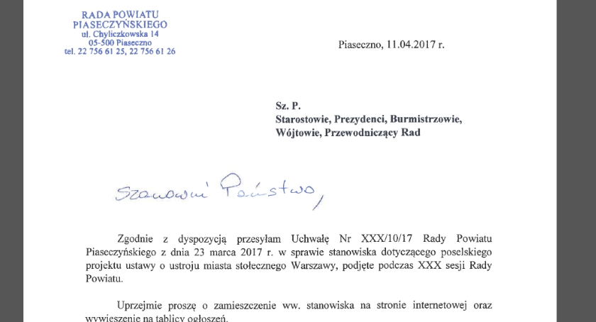 Uchwała Nr XXX/10/17 Rady Powiatu Piaseczyńskiego z dnia 23 marca 2017 r. w sprawie stanowiska dotyczącego poselskiego projektu ustawy o ustroju miasta stołecznego Warszawy, podjęte podczas XXX sesji Rady Powiatu.