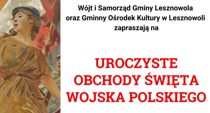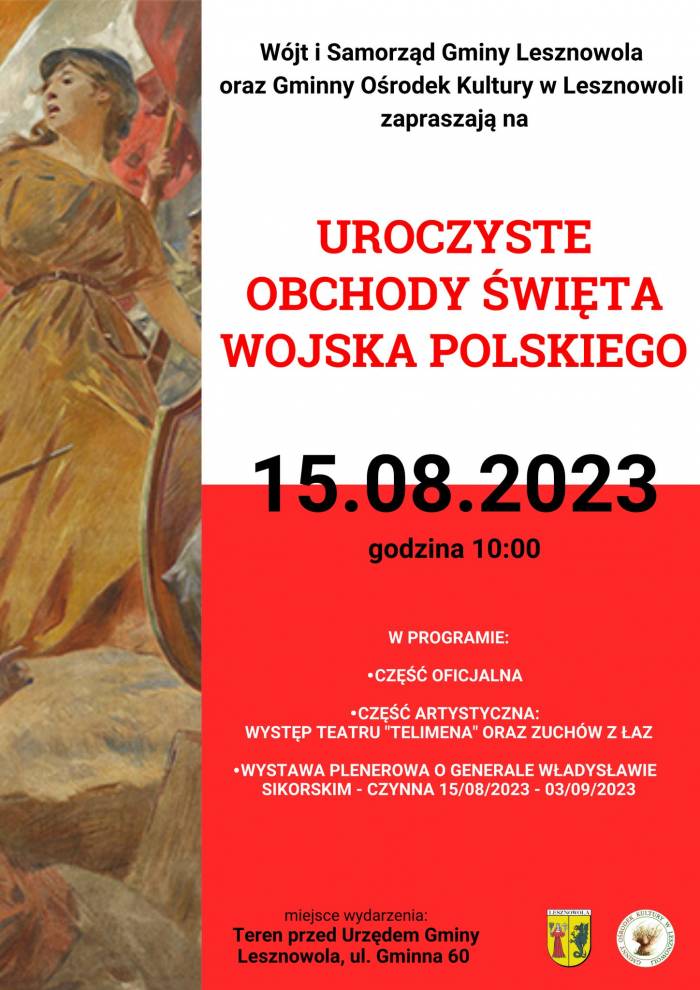 Zapraszamy na uroczyste obchody Święta Wojska Polskiego, które odbędą się w dniu 15.08.2023 roku o godzinie 10:00 przed Urzędem Gminy Lesznowola, przy ulicy Gminnej 60.