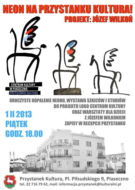 1 lutego 2013 roku o godz. 18.00 zabłyśnie na froncie Przystanku Kultura neon zaprojektowany przez Józefa Wilkonia. Zapraszamy na uroczyste odpalenie neonu na budynku Przystanku Kultura, oraz na wystawę szkiców i studiów Józefa Wilkonia do projektu logo Centrum Kultury w Pasiecznie. Pan Wilkoń poprowadzi również warsztaty plastyczne dla dzieci, których tematem będzie zaprojektowanie przez dzieci logo Centrum Kultury. Warsztaty są bezpłatne, prosimy zapisywać się w recepcji Przystanku Kultura, Pl. Piłsudskiego 9, Piaseczno, lub pod numerem tel. 22 716 79 62.