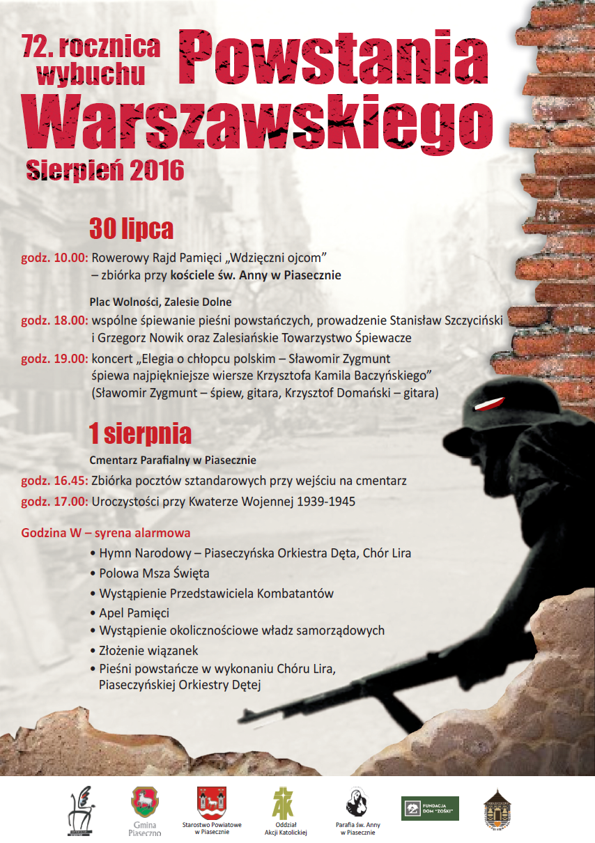 W poniedziałek 1 sierpnia 2016 r. uroczystości na Cmentarzu Parafialnym w Piasecznie rozpoczną się o godz. 16.45 zbiórką pocztów sztandarowych przy wejściu na cmentarz. Oficjalne uroczystości o godz. 17.00 odbędą się przy Kwaterze Wojennej 1939-1945