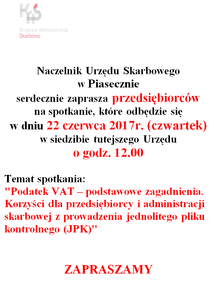 Naczelnik Urzędu Skarbowego w Piasecznie serdecznie zaprasza przedsiębiorców na spotkanie, które odbędzie się w dniu 22 czerwca 2017 r. (czwartek) w siedzibie tutejszego Urzędu o godz. 12.00