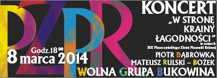 8 marca 2014 roku o godz. 18.00 zapraszamy na koncert „W stronę Krainy Łagodności” w ramach Piaseczyńskiego Zlotu Piosenki Różnej. Wystąpią dla Państwa Piotr Dąbrówka, Mateusz Rulski - Bożek oraz Wolna Grupa Bukowina. Koncert odbędzie się sali Domu Kultury w Piasecznie przy ul. Kościuszki 49. Bilety w cenie 25 złotych są do nabycia w kasach Centrum Kultury.
