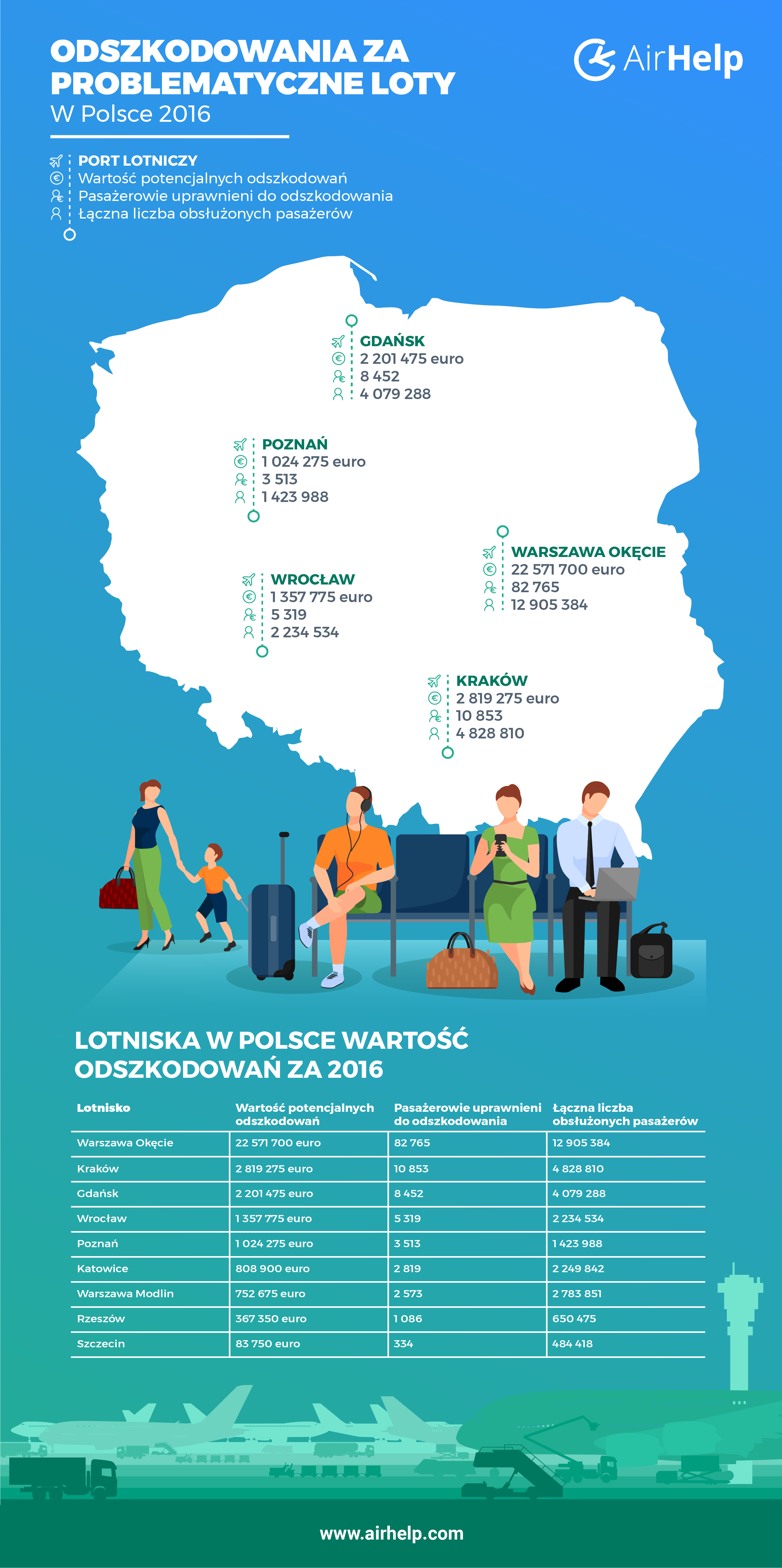 Tylko w 2016 roku warszawskie lotniska obsłużyły 15 689 235 pasażerów. Według danych AirHelp aż 85 338 z nich może ubiegać się o rekompensatę z tytułu opóźnionych czy odwołanych rejsów. Szacuje się, że linie lotnicze powinny wypłacić klientom wylatującym lub lądującym na lotniskach Okęcie czy Modlin łącznie ponad 23 mln euro. Tymczasem, jak wskazują statystyki, zaledwie 1% podróżnych jest świadomych swoich praw i składa wniosek o odszkodowanie.