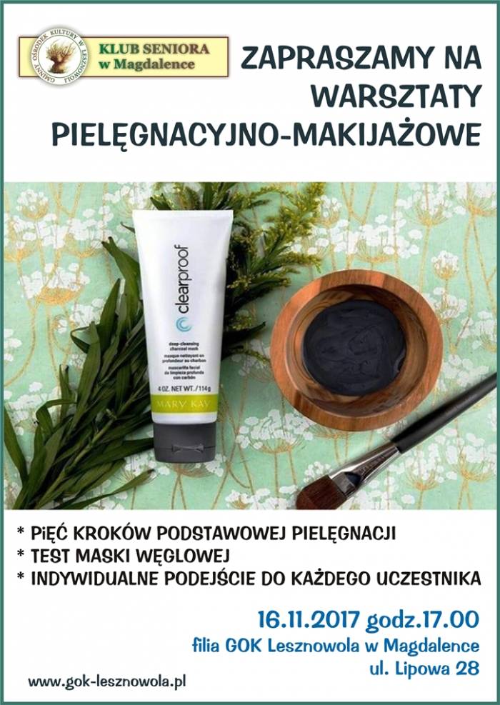 Już 16.11.2017 o godz. 17.00 odbędą się warsztaty pielęgnacyjno-makijażowe. Spotkanie w ramach Klubu Seniora w Magdalence. Miejsce: CIS Magdalenka, ul. Lipowa 28