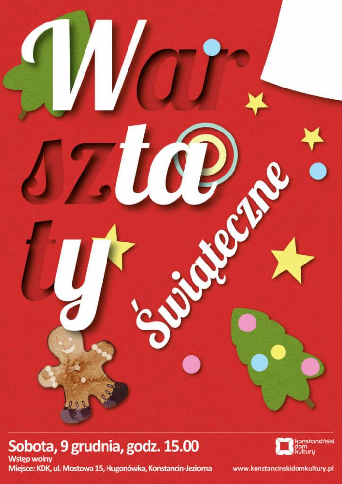 9 grudnia, godz. 15.00 odbędą się warsztaty świątecznie. Miejsce: Konstanciński Dom Kultury, ul. Mstowa 15 (Hugonówka). Wstęp wolny. Przedświąteczne rodzinne warsztaty, podczas których przy stole pełnym inspirujących materiałów plastycznych, przygotujemy bożonarodzeniowe dekoracje. Nie zabraknie ozdób choinkowych, barwnych stroików, a także pomysłów na opakowanie prezentów.