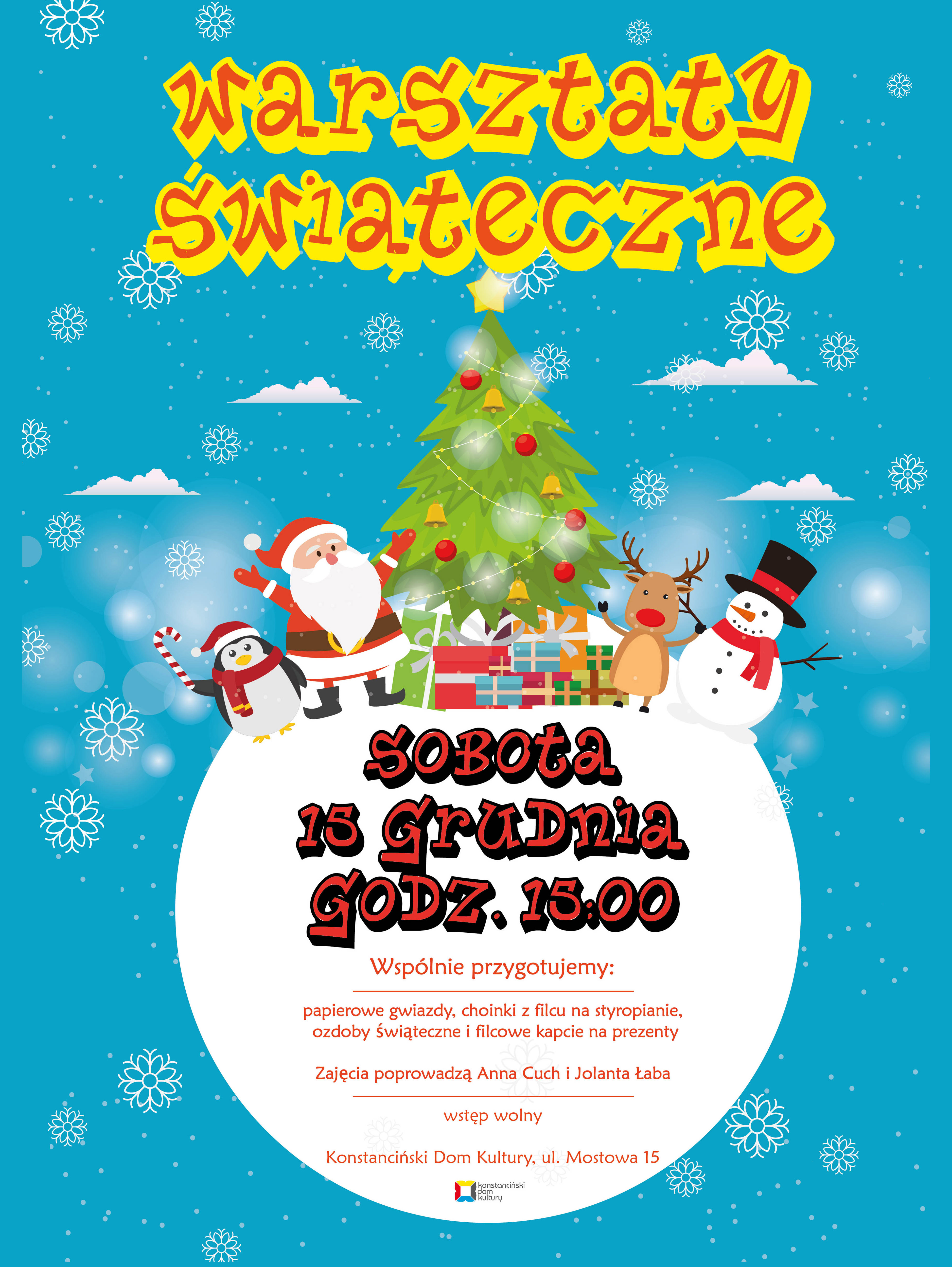 Konstanciński Dom Kultury przy ul. Mostowej 15 zaprasza do wspólnego spędzenia czasu, przy stole pełnym inspirujących materiałów plastycznych. Wspólnie przygotujemy papierowe gwiazdy, ozdoby świąteczne, choinki z filcu na styropianie i filcowe kapcie na prezenty. Miło i kreatywnie spędzimy czas, a przede wszystkim wprawimy się w świąteczny nastrój. Warsztaty świąteczne odbędą się w sobotę, 15 grudnia o godz. 15. Wstęp wolny. Zajęcia poprowadzą Anna Cuch i Jolanta Łaba.
