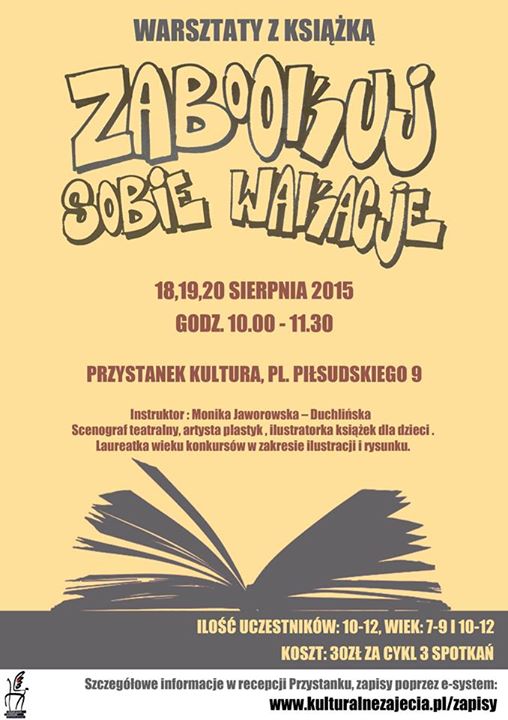 18, 19, 20 sierpnia 2015 roku w godz. 10.00-11.30 zapraszamy na warsztaty z książką pn.: Zabookuj sobie wakacje. Miejsce: Przystanek Kultura przy Pl. Piłsudskiego 9 w Piasecznie.