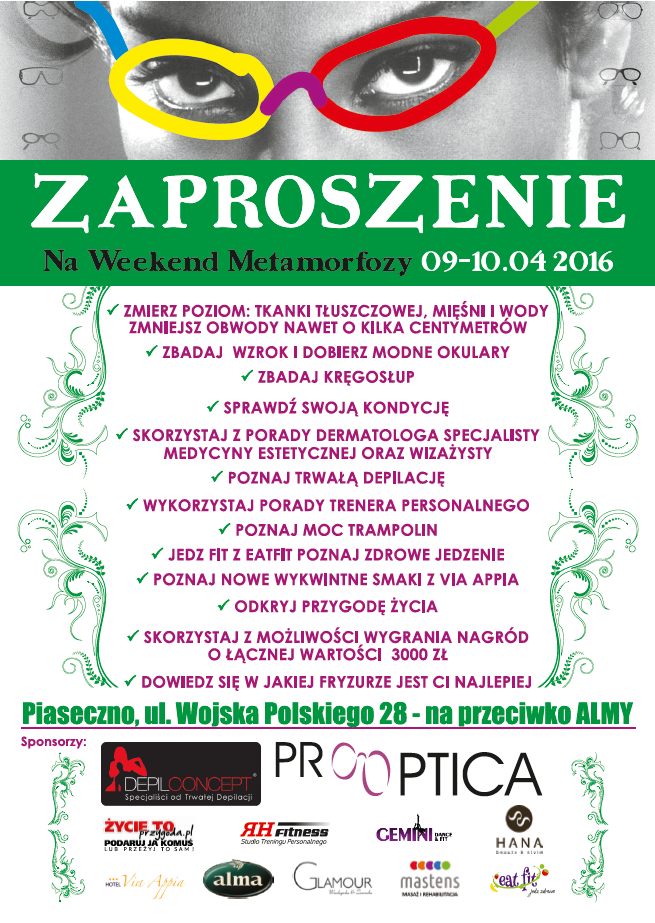 9-10 kwietnia 2016 r. w godz. od 10.00 do 18.00 organizowany jest Weekend Metamorfozy. Każdy chętny będzie mógł m.in. bezpłatnie zmierzyć poziom tkanki tłuszczowej, zbadać wzrok, skorzystać z porady dermatologa - specjalisty medycyny estetycznej oraz wizażysty. Prezentować się będą firmy z Piaseczna z branży medycznej, fryzjersko-kosmetycznej, kluby fitness, restauracje i inne. Szczegóły na plakacie: