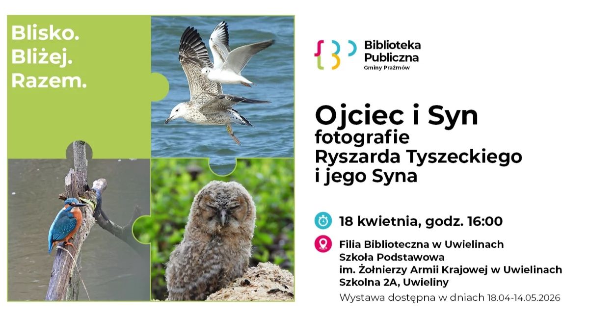 18 kwietnia 2026 roku o godz. 16.00 zapraszamy na wyjątkowy wernisaż fotografii przyrodniczej „Ojciec i Syn", prezentujący zdjęcia Ryszarda Tyszeckiego oraz jego syna. Wystawa poświęcona jest niezwykłemu światu ptaków tym, które żyją tuż obok nas: w okolicznych lasach, nad stawami, na polach i łąkach.