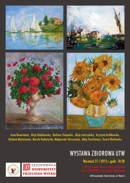 21 stycznia 2013 roku o godz. 18.00 odbędzie się Wernisaż Wystawy Zbiorowej UTW w świetlicy GOK Lesznowola w Starej Iwicznej przy ul. Nowej 6. Wieczór uświetni koncert kolęd i pastorałek Chóru UTW OKTAWA oraz wspólne kolędowanie. Zapraszamy!