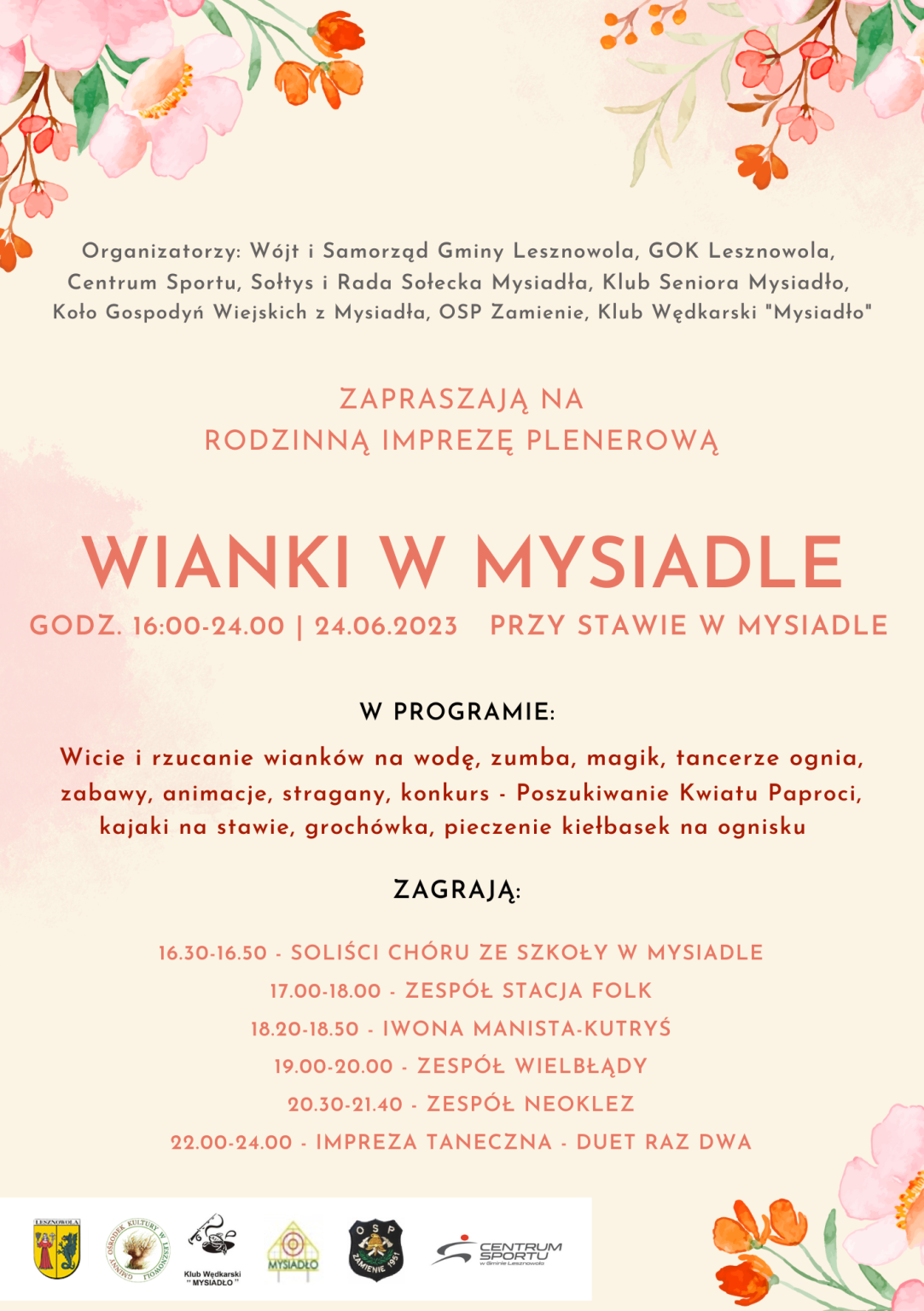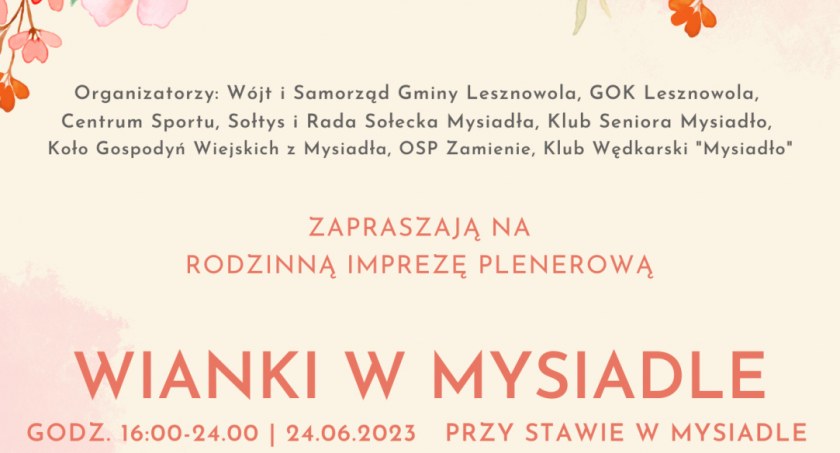 W sobotę, 24 czerwca 2023 roku, zapraszamy na rodzinną imprezę plenerową o nazwie "Wianki w Mysiadle", która odbędzie się przy malowniczym stawie. To wydarzenie, które nie może Cię ominąć!