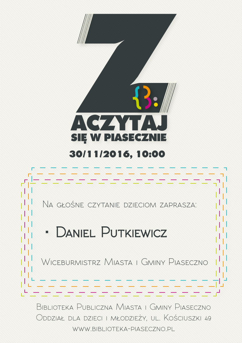 30 listopada 2016 r. o godz. 10:00 w ramach akcji Zaczytaj się w Piasecznie, gościem specjalnym w Bibliotece, będzie I Zastępca Burmistrza Daniel Putkiewicz.