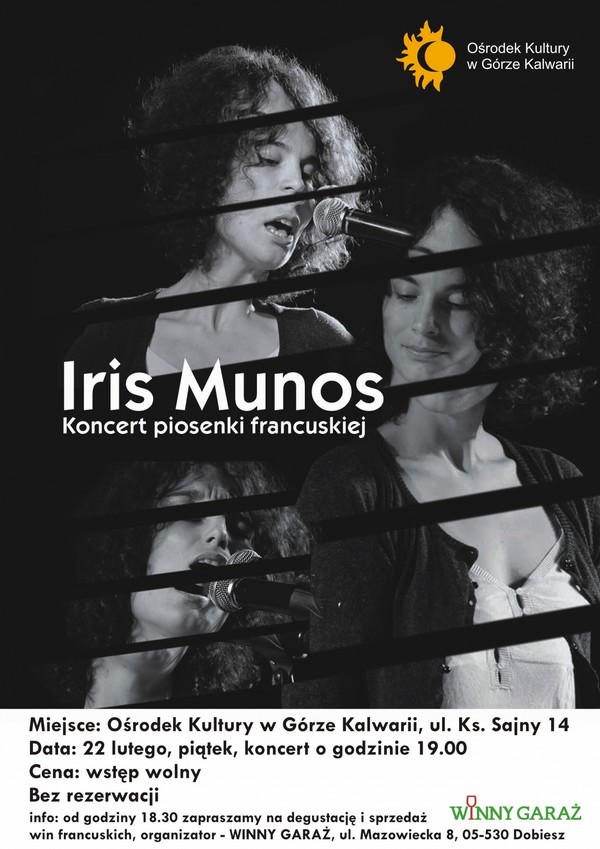 22 lutego 2013 roku zapraszamy na wieczór francuski. Podczas wieczoru francuskiego piosenki niezapomnianej Edith Piaf zaśpiewa dla nas Iris Munos. Imprezie towarzyszyć będzie degustacja win francuskich zorganizowana przez "Winny Garaż" - Sklep z winami z Dobieszy, ul. Mazowiecka 8. Miejsce: Ośrodek Kultury w Górze Kalwarii, ul. Ks. Sajny. Zapraszamy!