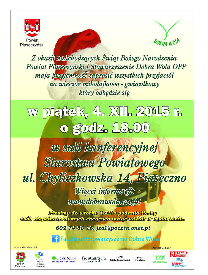 Stowarzyszenie Dobra Wola oraz Powiat Piaseczyński zapraszają na wieczór mikołajkowo-gwiazdkowy, który odbędzie się w sali konferencyjnej Starostwa Powiatowego przy ul. Chyliczkowskiej 14 o godz. 18.00.