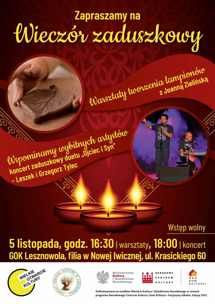 5 listopada 2022 r. godz. 18.00 odbędzie się koncert Duetu Ojciec i Syn. Wieczór Zaduszkowy pt. "Wspominamy wybitnych Artystów". Miejsce: filia GOK Lesznowola w Nowej Iwicznej, ul. Krasickiego 60.