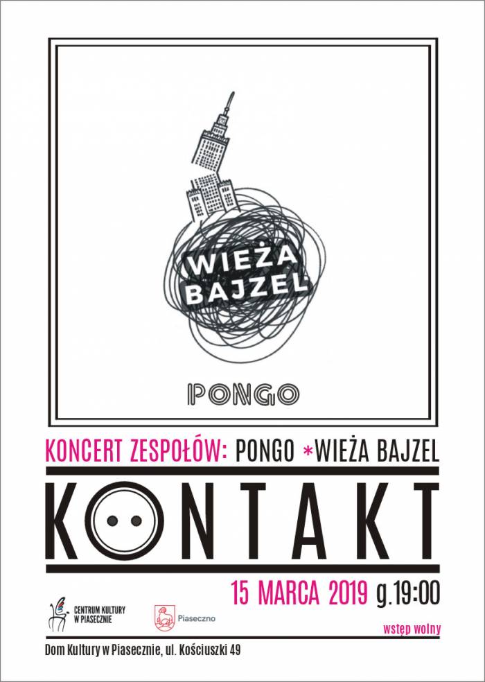 15 marca 2019 roku o godz. 19:00 w ramach cyklu Kontakt, odbędzie się koncert zespołu Wieża Bajzel oraz Pongo. Wstęp wolny. Miejsce: Dom Kultury przy ul. Kościuszki 49 w Piasecznie. Zapraszamy!