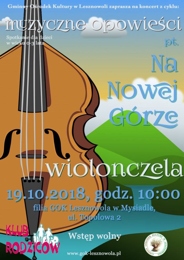 19.10.2018 r. godz. 10.00 - Koncercik dla maluszków na wiolonczeli z cyklu "Muzyczne opowieści" w Klubie Rodziców. Miejsce: filia GOK Lesznowola w Mysiadle, ul. Topolowa 2. Wstęp wolny.