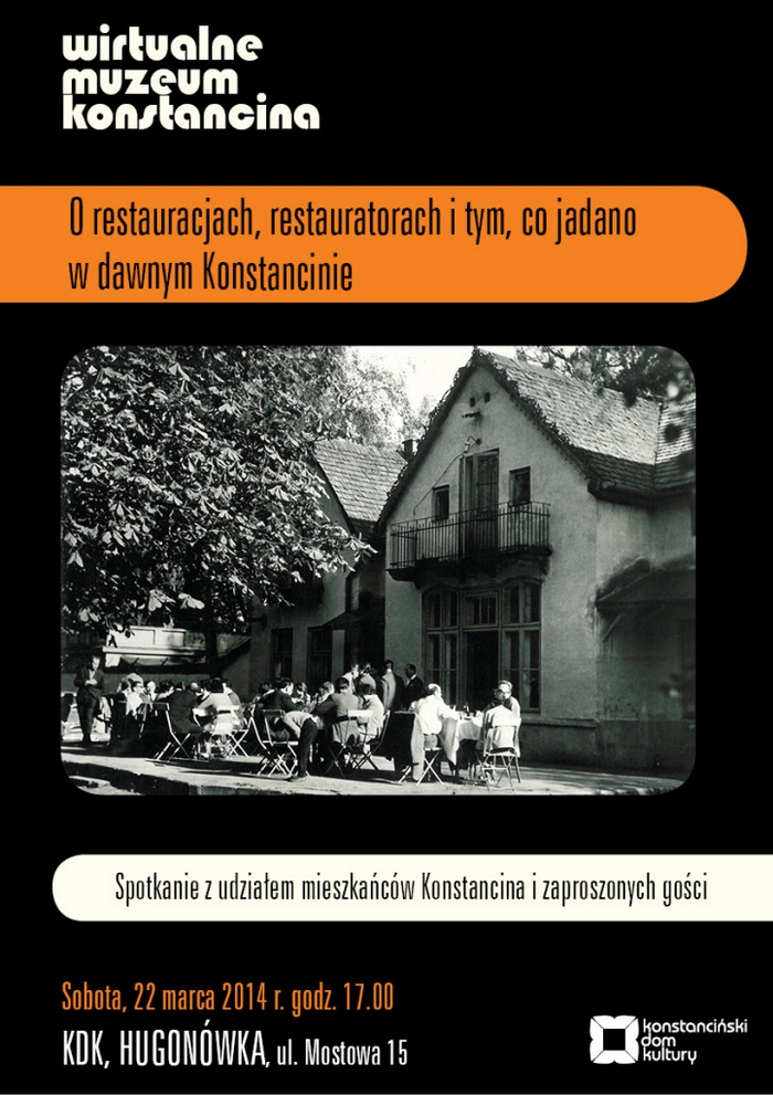 22 marca 2014 roku o godz. 17.00, Konstanciński Dom Kultury zaprasza na kolejne spotkanie z cyklu Wirtualne Muzeum Konstancina. Miejsce: KDK, Hugonówka, ul. Mostowa 15. Podczas spotkania z udziałem Rajmunda Berentowicza, wnuka Franciszka Berentowicza, słynnego właściciela konstancińskiej cafe-restaurant "Casino" oraz kawiarni "Elite" spróbujemy opowiedzieć o miejscach gdzie można było jeść, bawić się, gdzie urządzano bale, dancingi, koncerty, konkursy, loterie fantowe i inne przedsięwzięcia. Przypomnimy ludzi, którzy tworzyli niepowtarzalny klimat tych miejsc, oraz porozmawiamy o niezwykłych gościach którzy je odwiedzali.