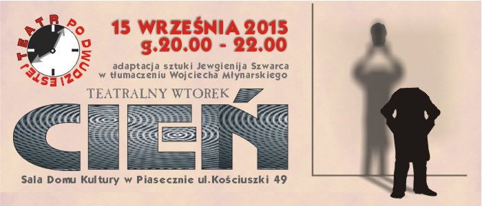 15 września 2015 roku w godz. 20.00 - 22.00 odbędzie się Wtorek Teatralny, podczas którego wystąpi Teatr Po 20-tej i przedstawi spektakl Cień w reż. Ewy Kłujszo. Miejsce: Piaseczno, Sala Domu Kultury, ul. Kościuszki 49. Wstęp 10 złotych.