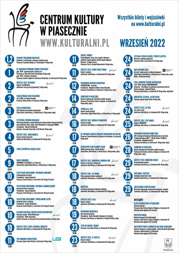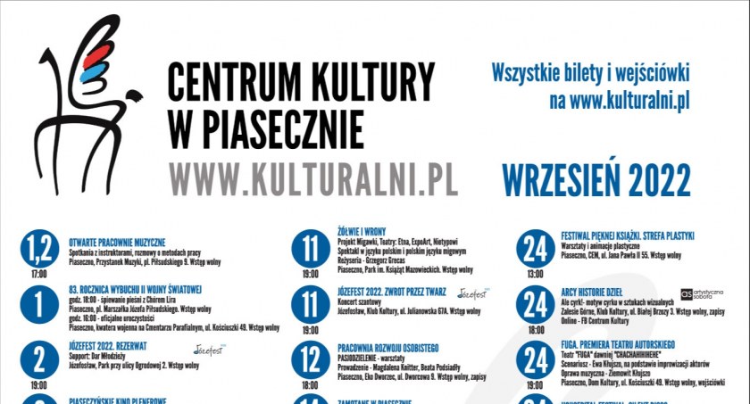 Zachęcamy mieszkańców do zapoznania się z kalendarium wydarzeń, które Centrum Kultury w Piasecznie organizuje we wrześniu 2022.