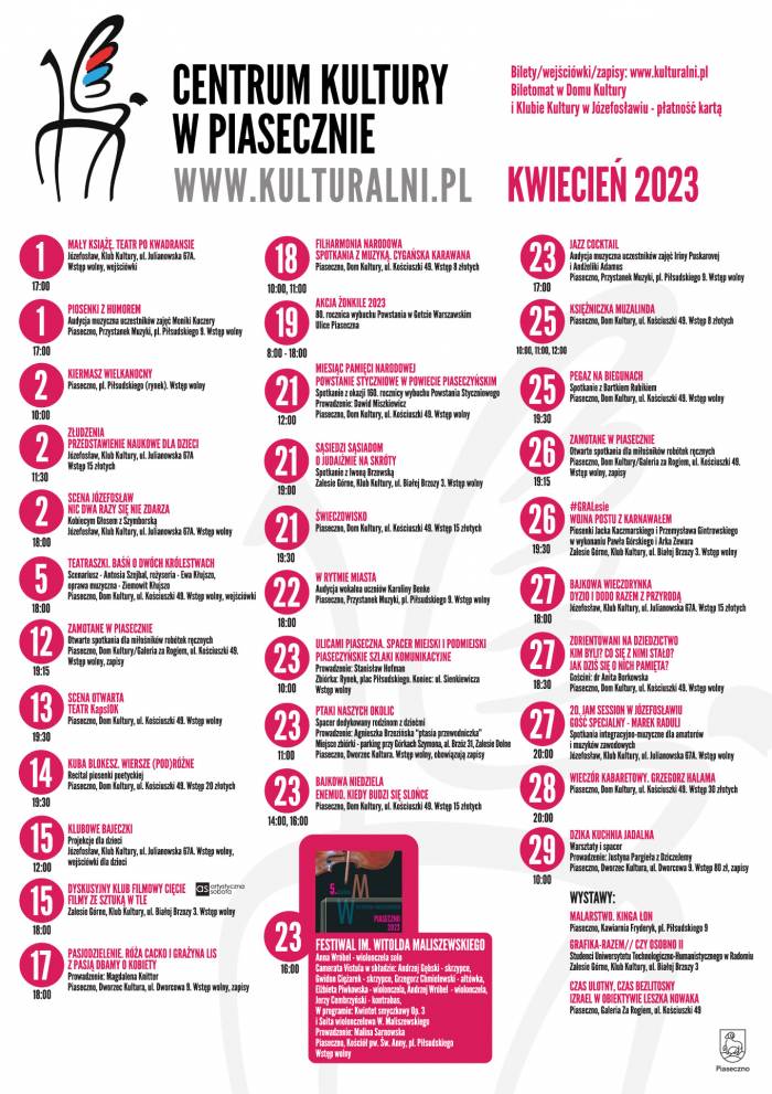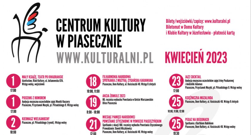 Zachęcamy mieszkańców do zapoznania się z kalendarium wydarzeń, które Centrum Kultury w Piasecznie organizuje w kwietniu 2023.