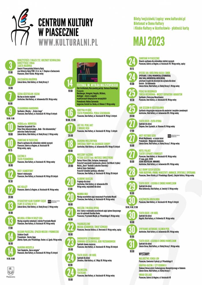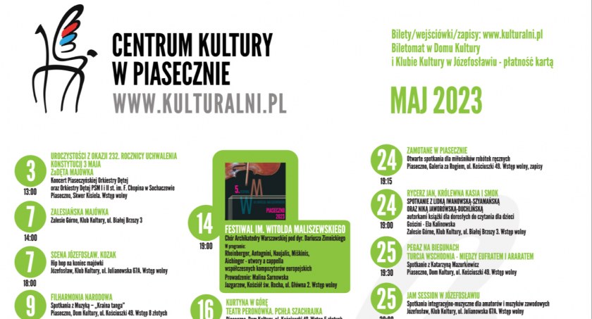 Zachęcamy mieszkańców do zapoznania się z kalendarium wydarzeń, które Centrum Kultury w Piasecznie organizuje w maju 2023.