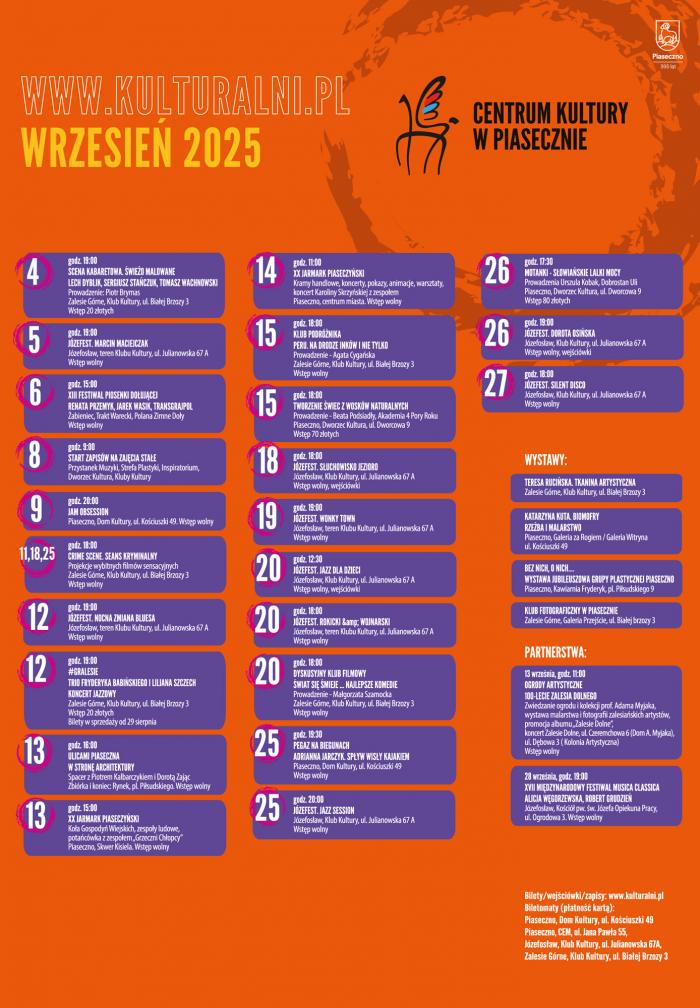 Zachęcamy mieszkańców do zapoznania się z kalendarium wydarzeń, które Centrum Kultury w Piasecznie organizuje we wrześniu 2025.