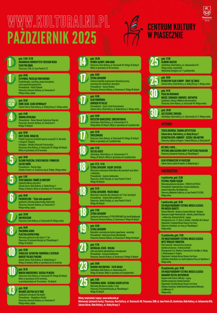 Zachęcamy mieszkańców do zapoznania się z kalendarium wydarzeń, które Centrum Kultury w Piasecznie organizuje w październiku 2025.