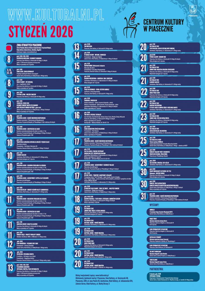 Zachęcamy mieszkańców do zapoznania się z kalendarium wydarzeń, które Centrum Kultury w Piasecznie organizuje w styczniu 2026.